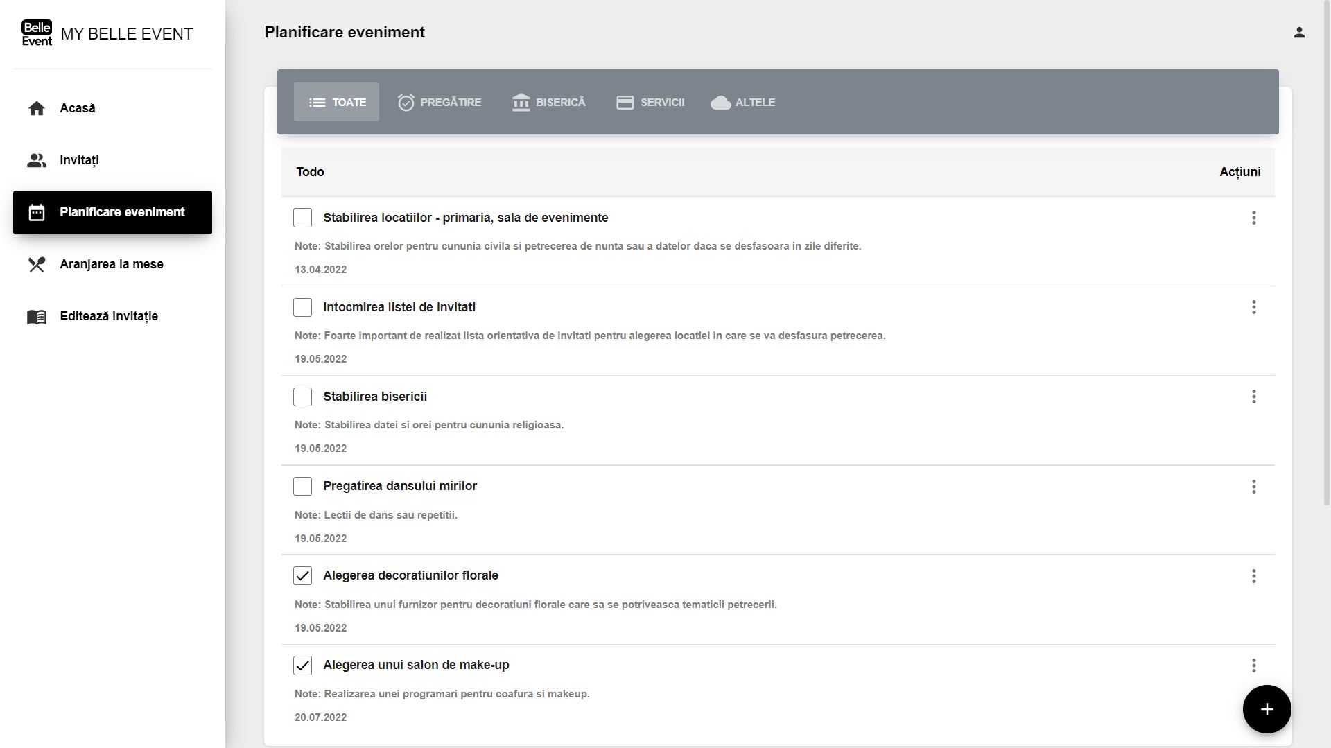 Aplicația My Belle Event va genera automat o agendă cu activitățiile necesare în funcție de categoria evenimentului (de ex: nuntă, botez, party). De asemenea, vă puteți personaliza lista în funcție de nevoile dumeavoastră.